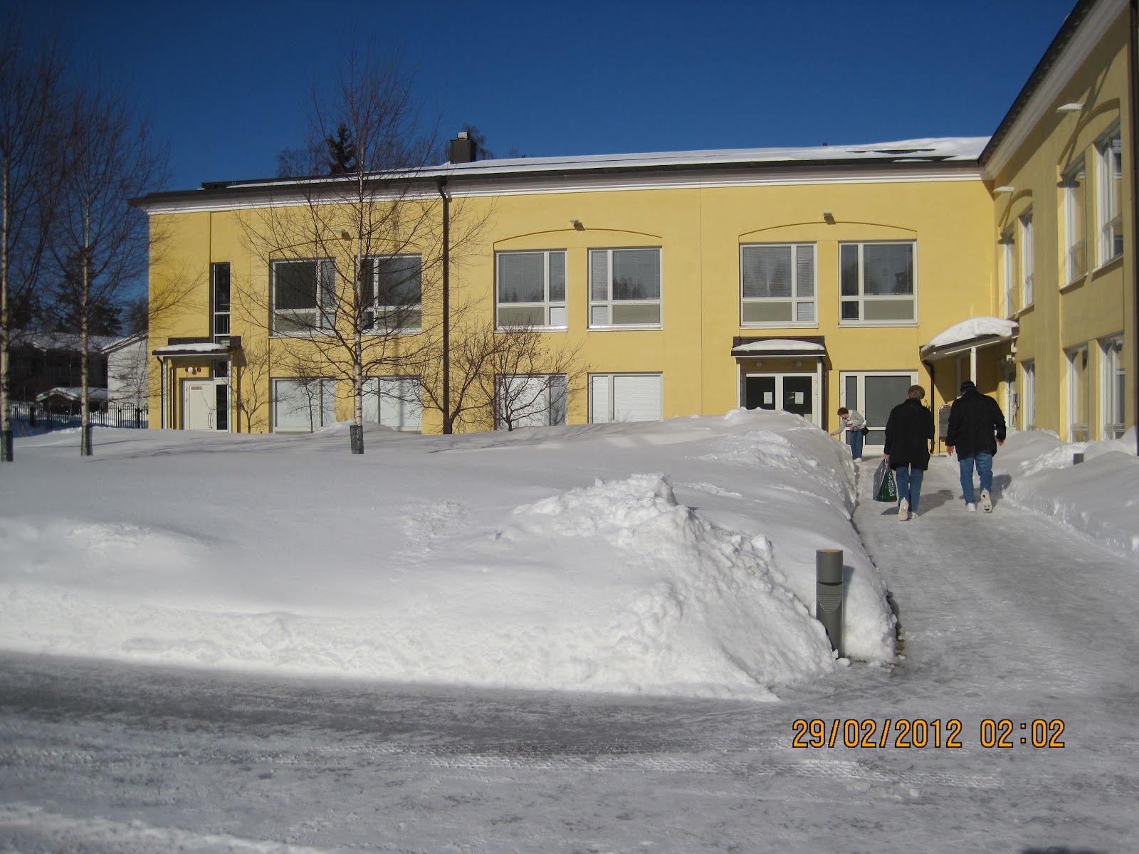 Last Tuesday, February 27, 2012, it snowed in Espoo ALL day. ALL DAY! A beautiful, peaceful, morning till night snow. The next morning I was looking out our window. There was a child, 9 -11 age group, walking on the 'path' that had been there the day before. It's a path on the side of our building. He was really struggling.....one foot in....sinks a foot or so.....lift out and other foot sinks in. He made it to the bridge and across. No better on the other side. Takes a few labored steps and then falls forward on his knees and starts to crawl! He crawled all the way to the path that meets this one. Pulling his bag and just crawled and did much better on his knees than he had done on his feet! It's a fair distance to crawl. The other path is out where the tower is and trees along it. Then he rose up, turned left and continued on his way, walking like nothing had happened, on a better traveled path! so funny to watch.